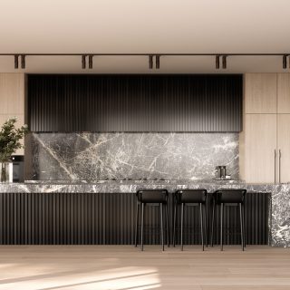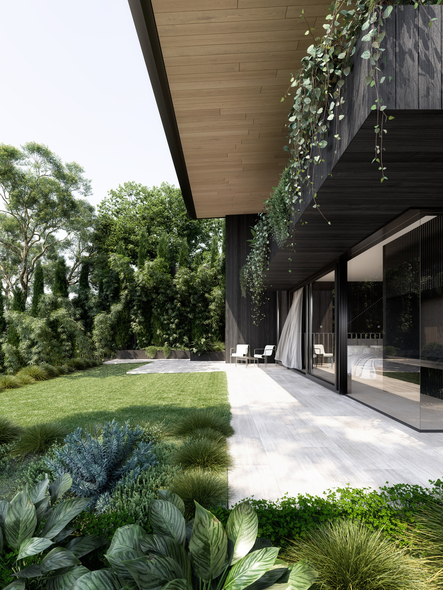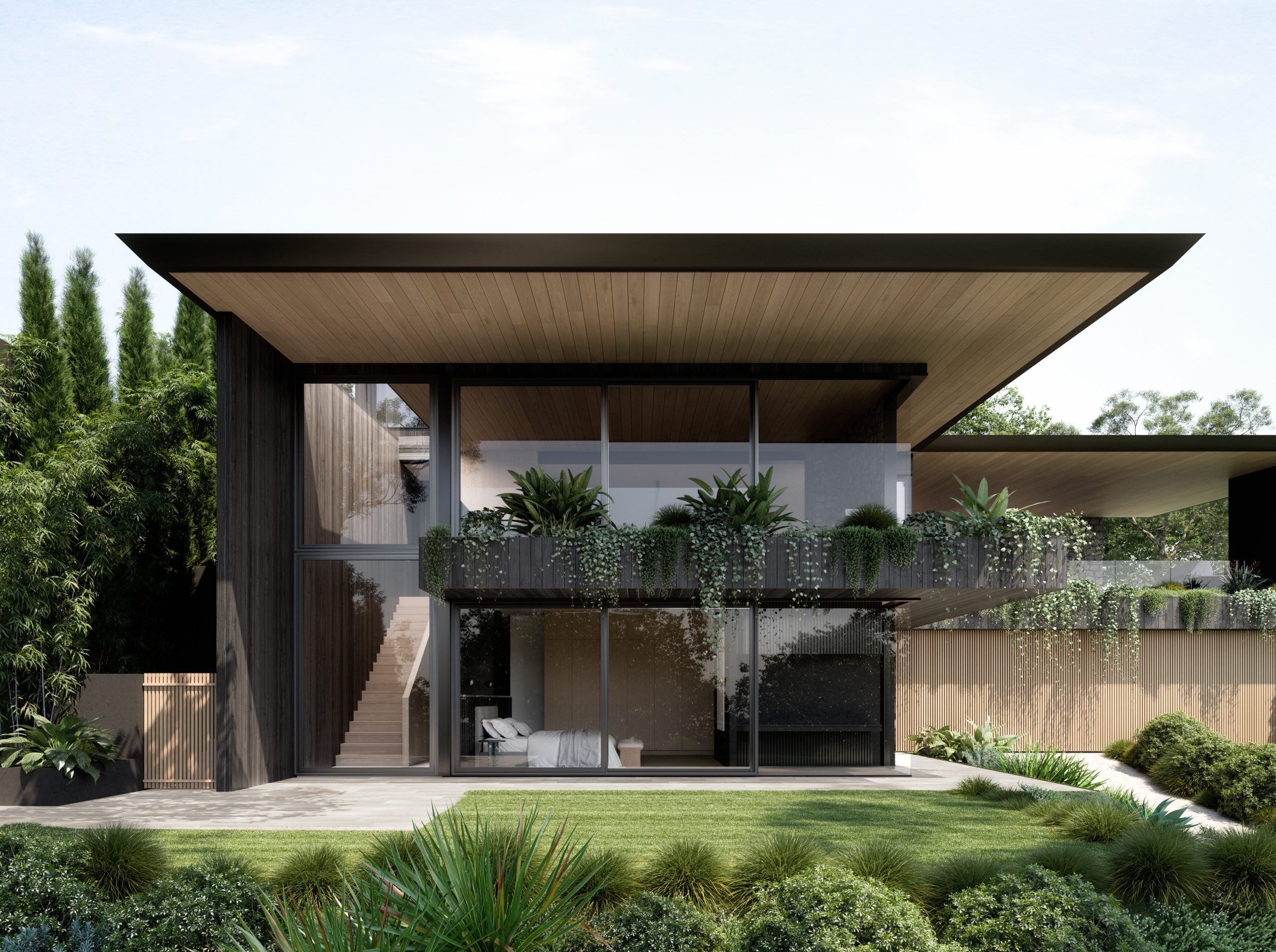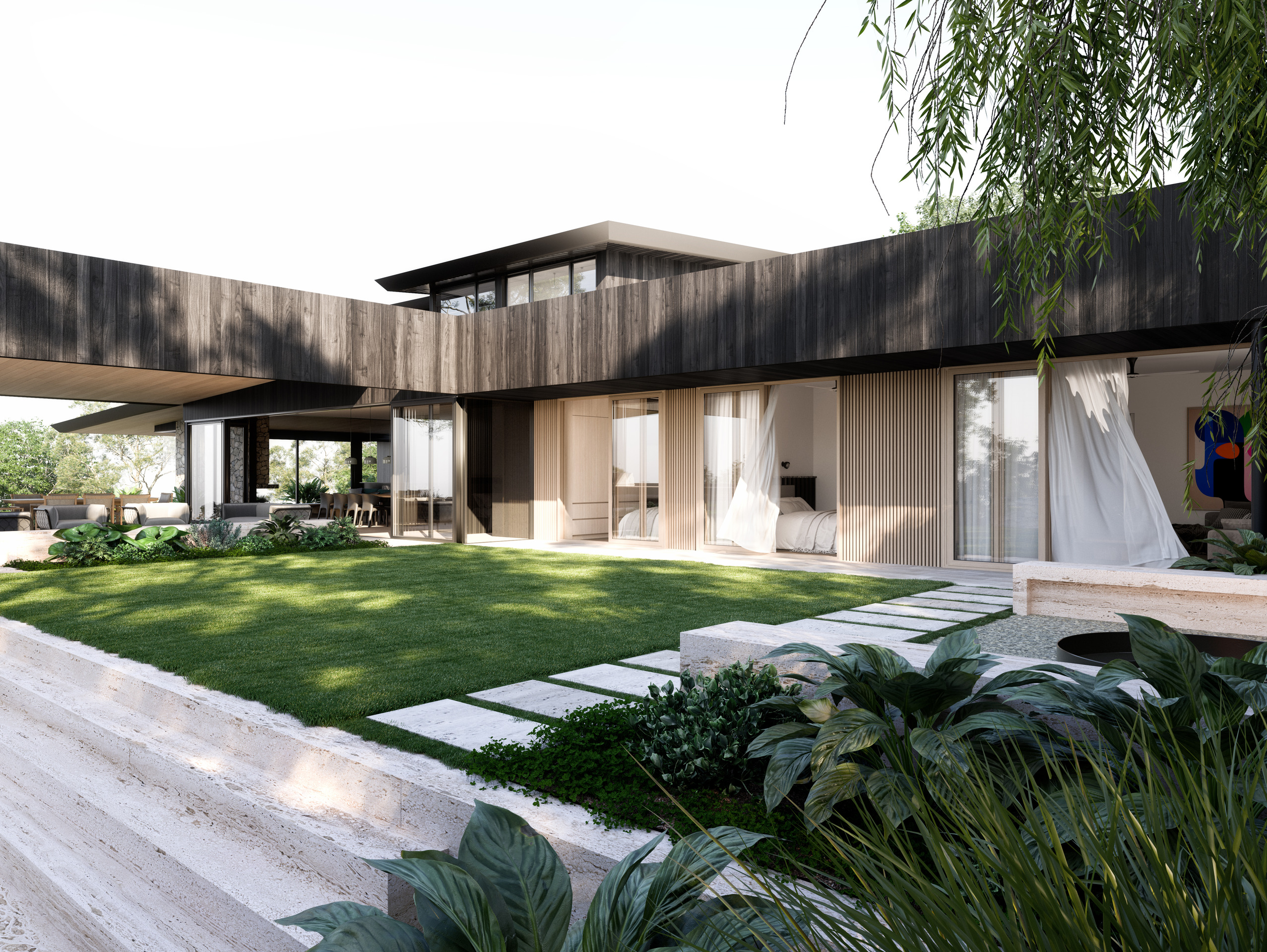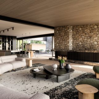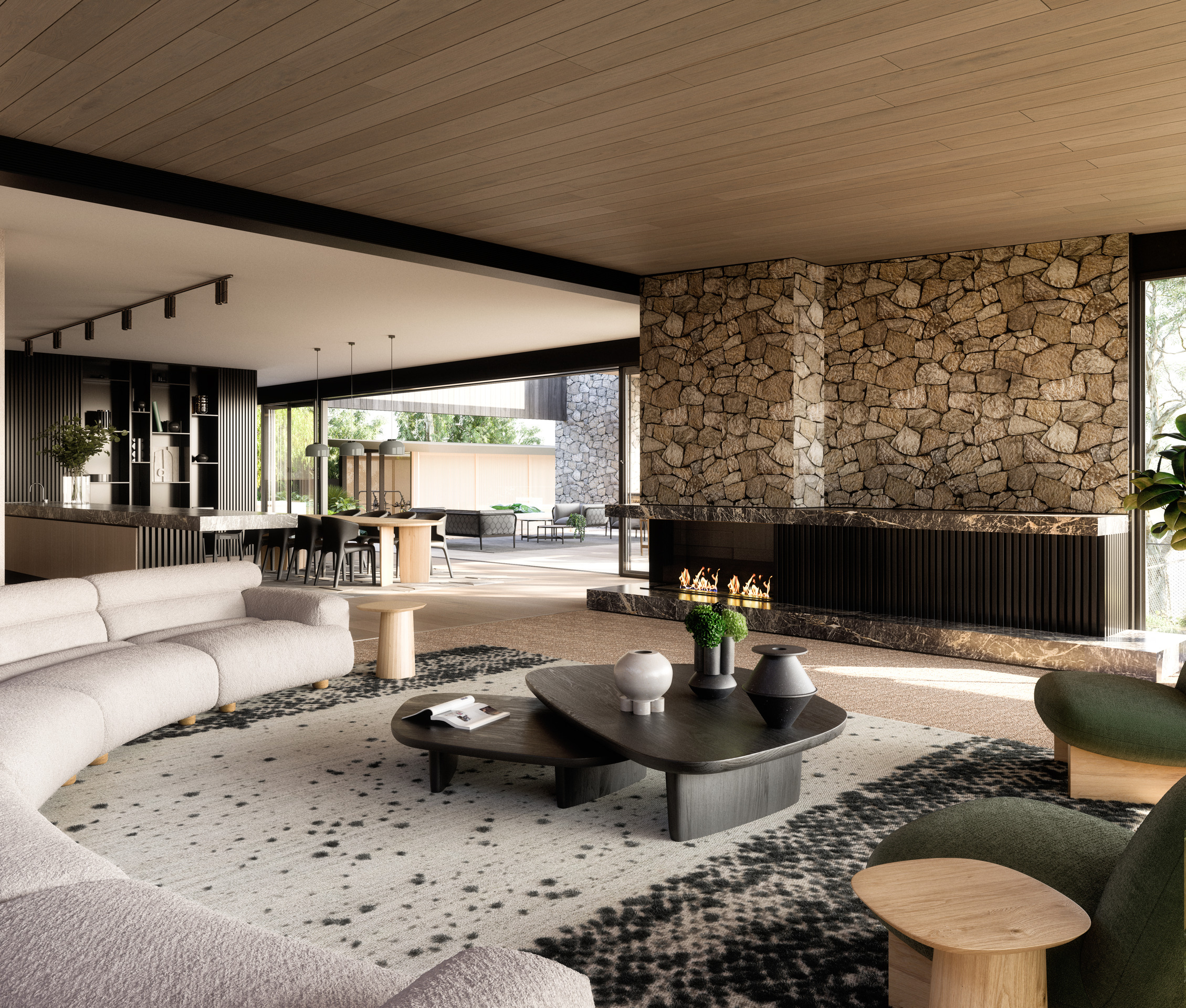 This project on Braeside Terrace is a masterclass in contemporary luxury, designed to harmonise with its elevated, sloping site. The home’s striking exterior is clad in charred timber shiplap, with beautiful hardwood timber linings and cladding that create a warm, natural aesthetic. Complementing this is a freeform stone wall and cobblestone driveway, adding texture and timeless elegance to the overall design. Floor-to-ceiling Vitrocsa windows and doors blend the indoor and outdoor spaces, with flush transitions enhancing the open, airy feel.